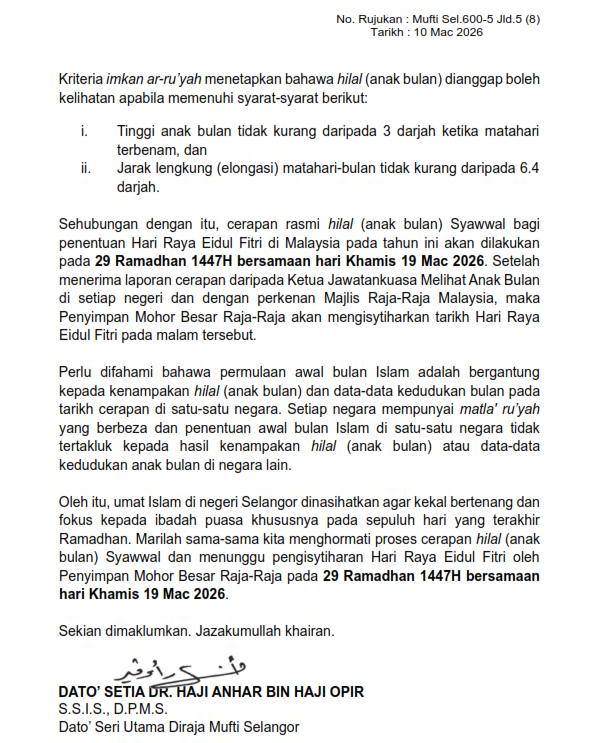 Therefore, Muslims in the State of Selangor are advised to remain calm and focus on fasting, especially in the last ten days of Ramadan. Let us all respect the sighting of the new moon for Shawwal and look forward to the declaration of Eid al-Fitr by the Keeper of the Great Seal of Kings on 29 Ramadhan 1447H coincides with Thursday 19 March 2026.