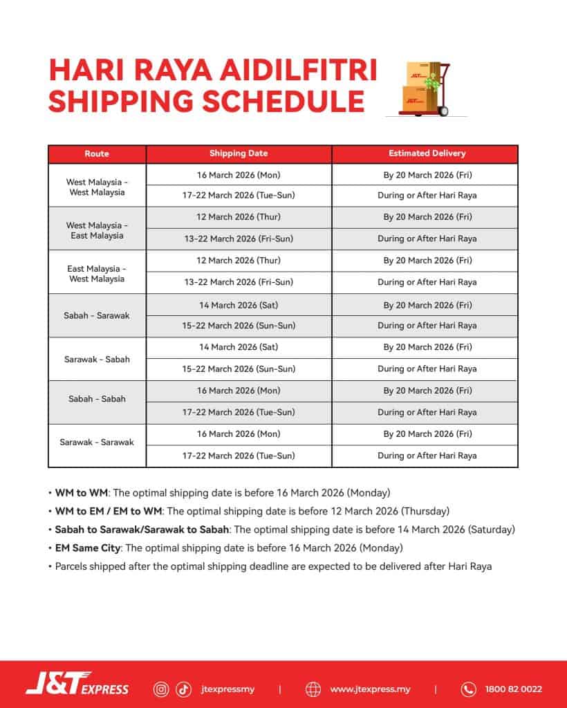 The following is a summary of the J&T Express delivery schedule in conjunction with Hari Raya Aidilfitri 2026: